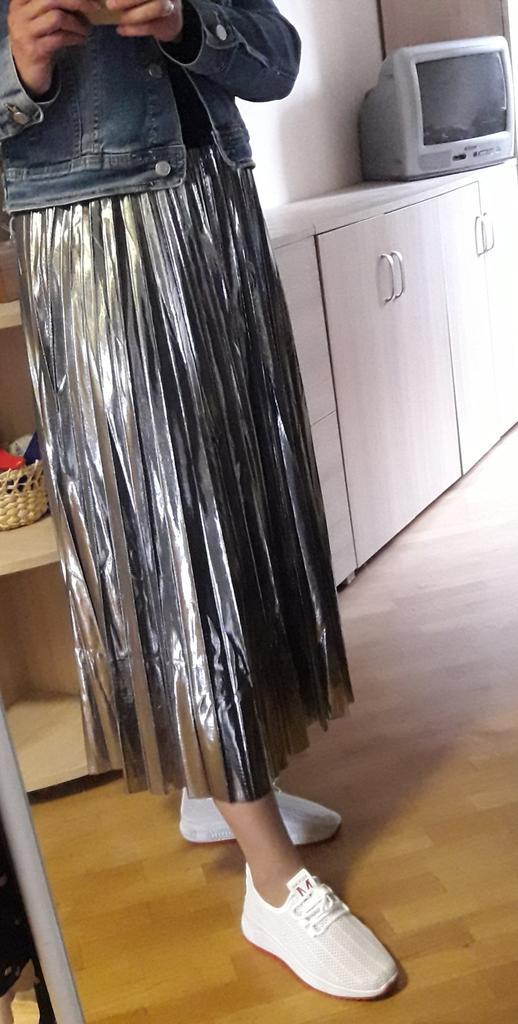 Dámská kovová skládaná sukně Midi třpytivá lesklá linie s vysokým pasem