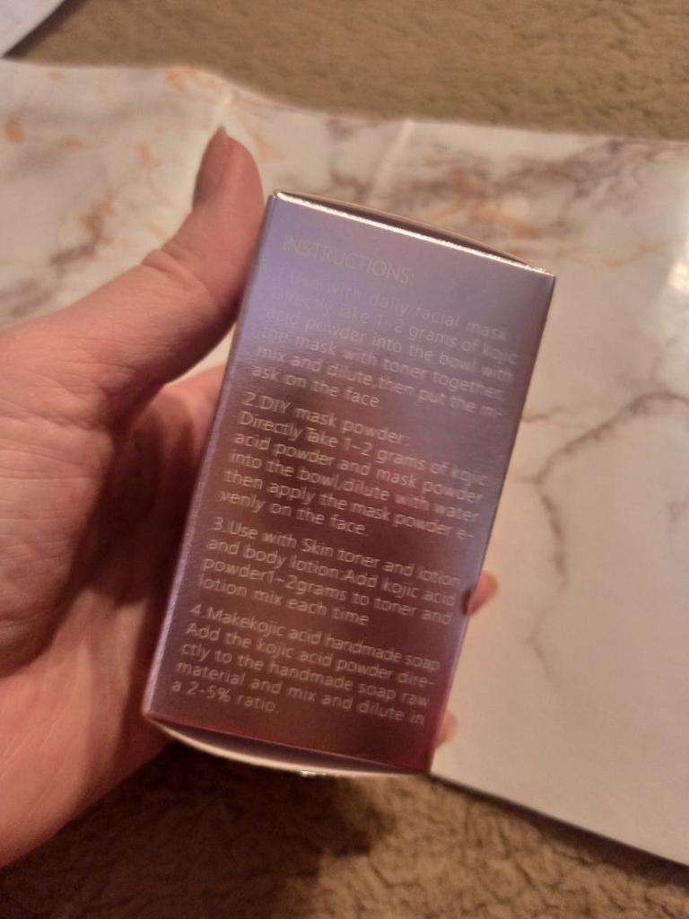 Přímo Vezměte 1~2 gramy prášku kyseliny kojové a prášku masky do misky, zřeďte vodou a poté rovnoměrně naneste prášek masky na obličej.