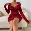 2025 Autumn New Women's Solid Color Contrast Lace Slit Sexy Tight Dress