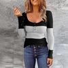 Women's Casual Fashion U-neck Contrast Color Long Sleeve Button T-shirt