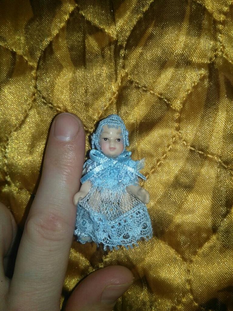 Eine Miniaturpuppe, 5-6 cm, aber mit gut gezeichnetem Gesicht, beweglichen Gliedmaßen und einem bezaubernden Spitzenkleid. Vielen Dank an alle. Ich empfehle es.