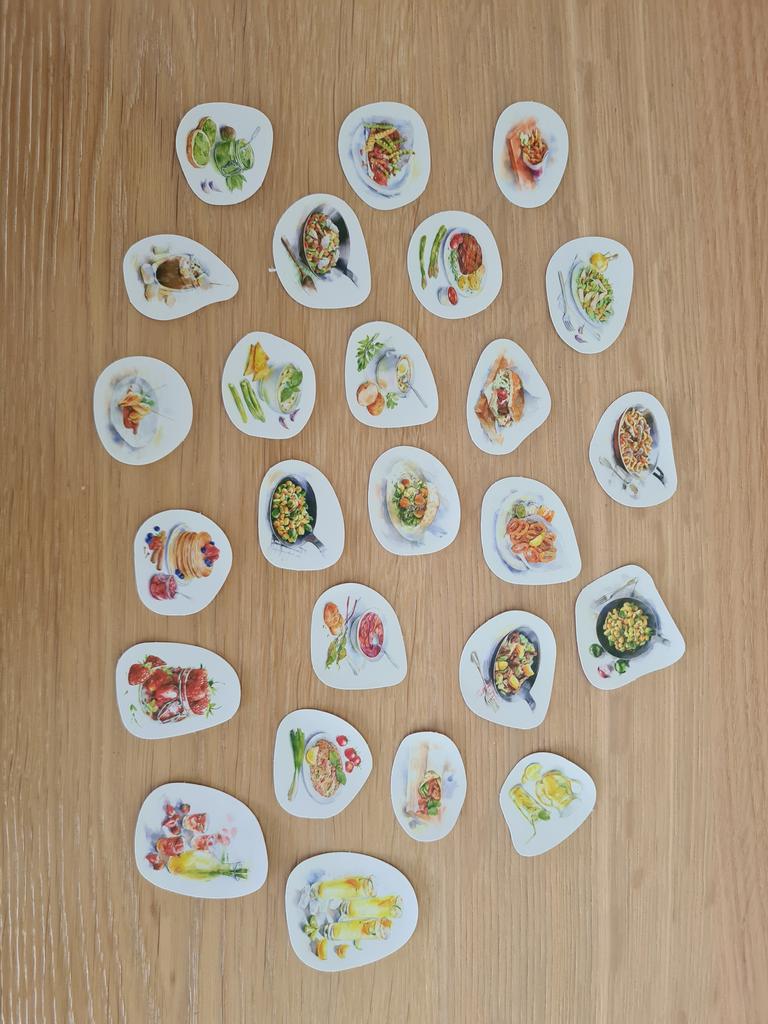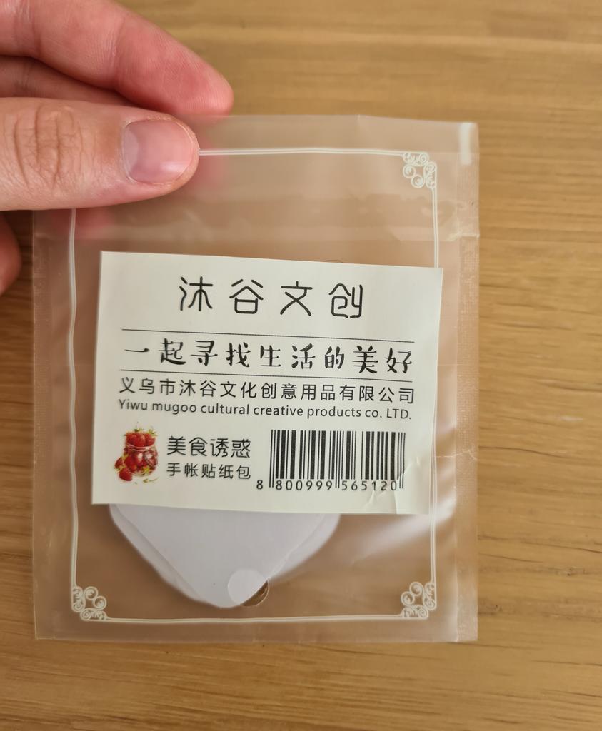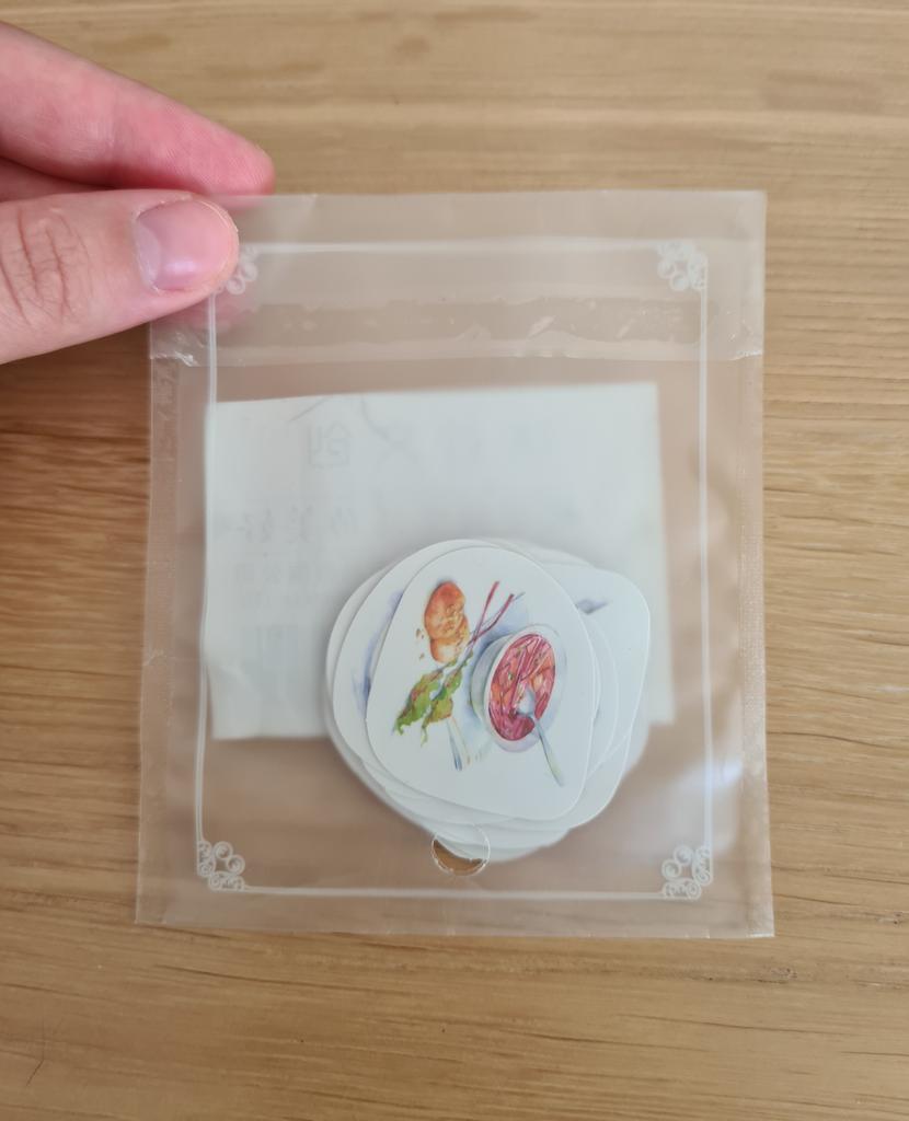 I really like the Stickers. They came to me securely packaged and in best condition. Joom shipped my stickers here tucked in a triple layer plastic wrap. This was rather confusing to me, because the stickers are wrapped in a transparent plastic wrap already, in order for them to stay in place and not fall out. I dont think this is up to our time standard anymore. They should switch to more sustainable matierials and quit using all this material when it isn't needed. Now to the stickers: You'll receive a total of 25 stickers which are made out of paper. Around them is a thick, white edge that frames the actual motif. The print quality is amazing. They're sharp and the variety of motifs is great (take a look at the pictures) Each sticker-dish is unique, so you'll have to be careful what you use them on, though. Now, they dont stick to paper too well. I can easily peel them off without damaging the paper ynderneath. This may be a good thing for some of you hut I'm annoyed by this.