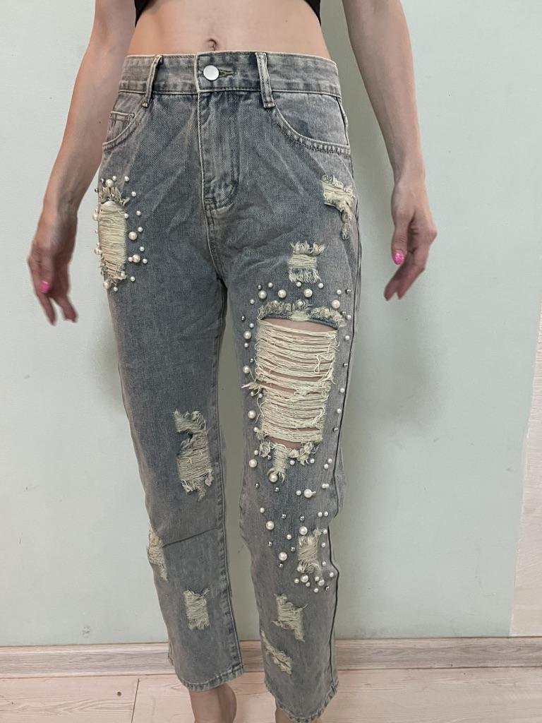 Summer Women's Fashion Ripped Jeans New Loose High Waist Jeans Beads Rhinestones Harem Pants Female Street Holes Denim Trousers