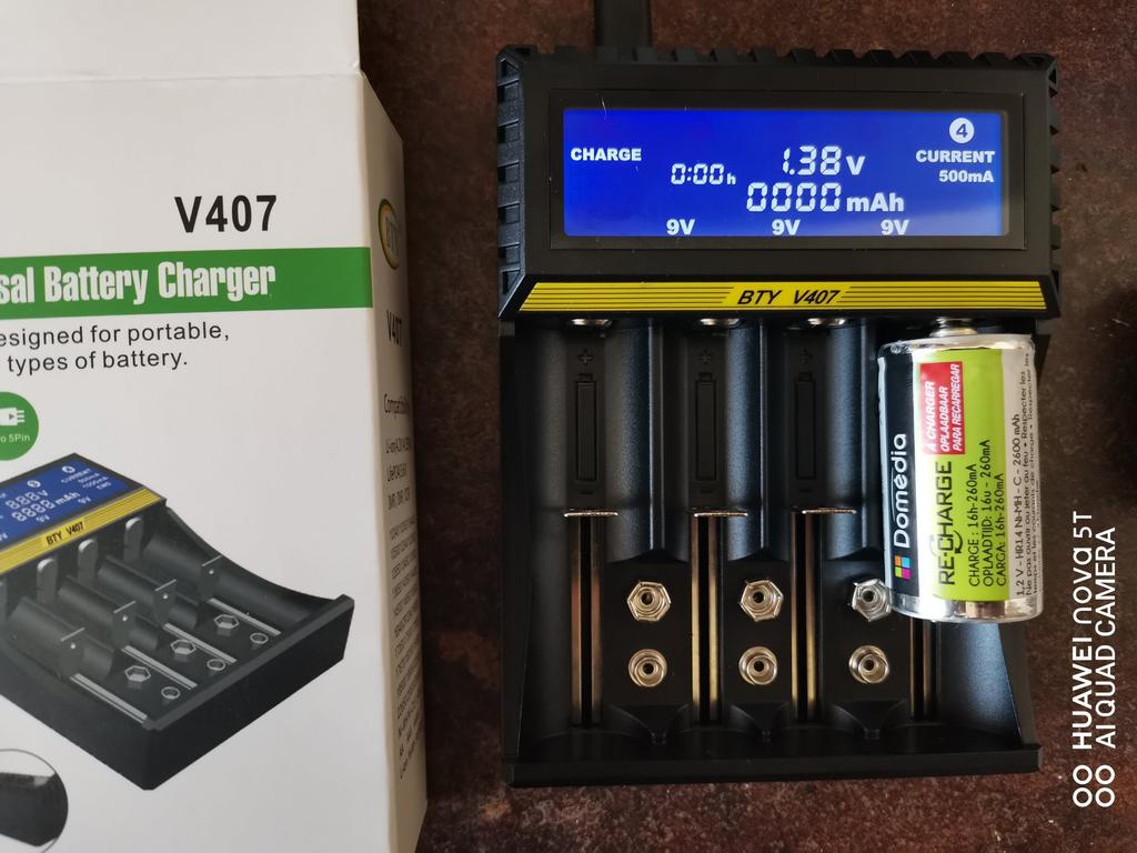 חבר צד אחד של הכבל למטען V407, בצד השני למטען DC 5V 2A. כאשר החשמל דולק, תאורת LCD אחורית תזרח, והמטען יזהה באופן אוטומטי את מצב ההספק, בינתיים LCD יציג את כל הנתונים, 3 שניות מאוחר יותר, LCD יציג NULL ואת 3 סמלי 9V.
