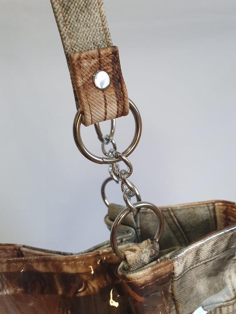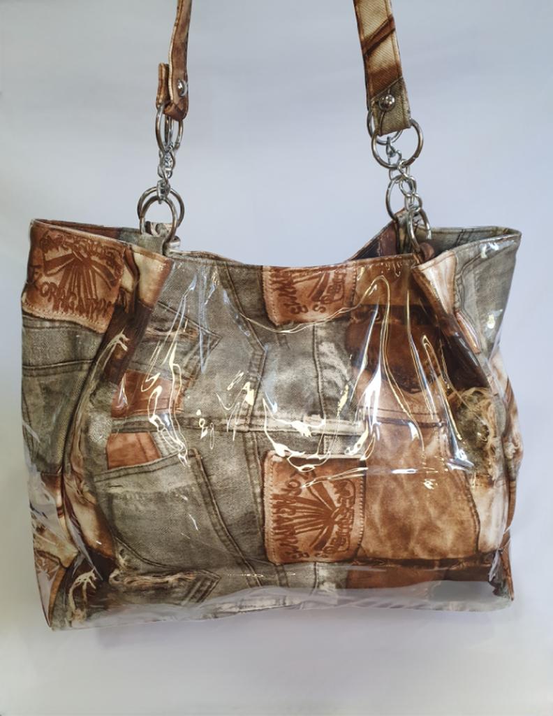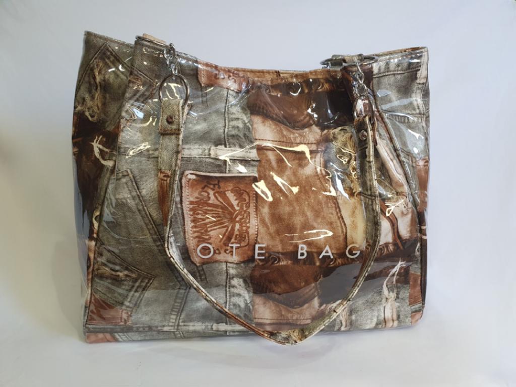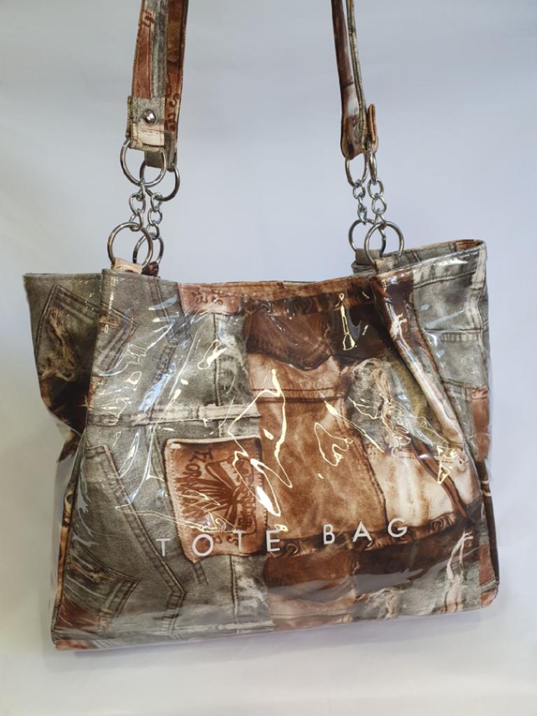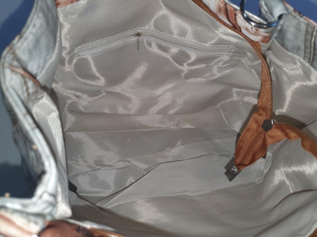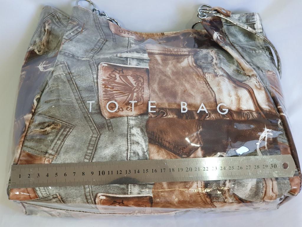 Veldig interessant veske med jeansstoffmønster på innsiden og klar PU på utsiden. Vesken har stor kapasitet, fôr på innsiden med noen få lommer. Leveringen tok nesten 4 uker til Irland. God shopping!