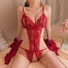Sexy Red Crotchless Lingerie Women Lace Hollow Erotic Costumes Deep V Underwear Backless Semi-Sheer Babydoll Dress Women Bra Set