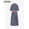 Zaprha 2025 Autumn New With Belt Puff sleeve round V-neck Shirt Midi Dress 8193325
